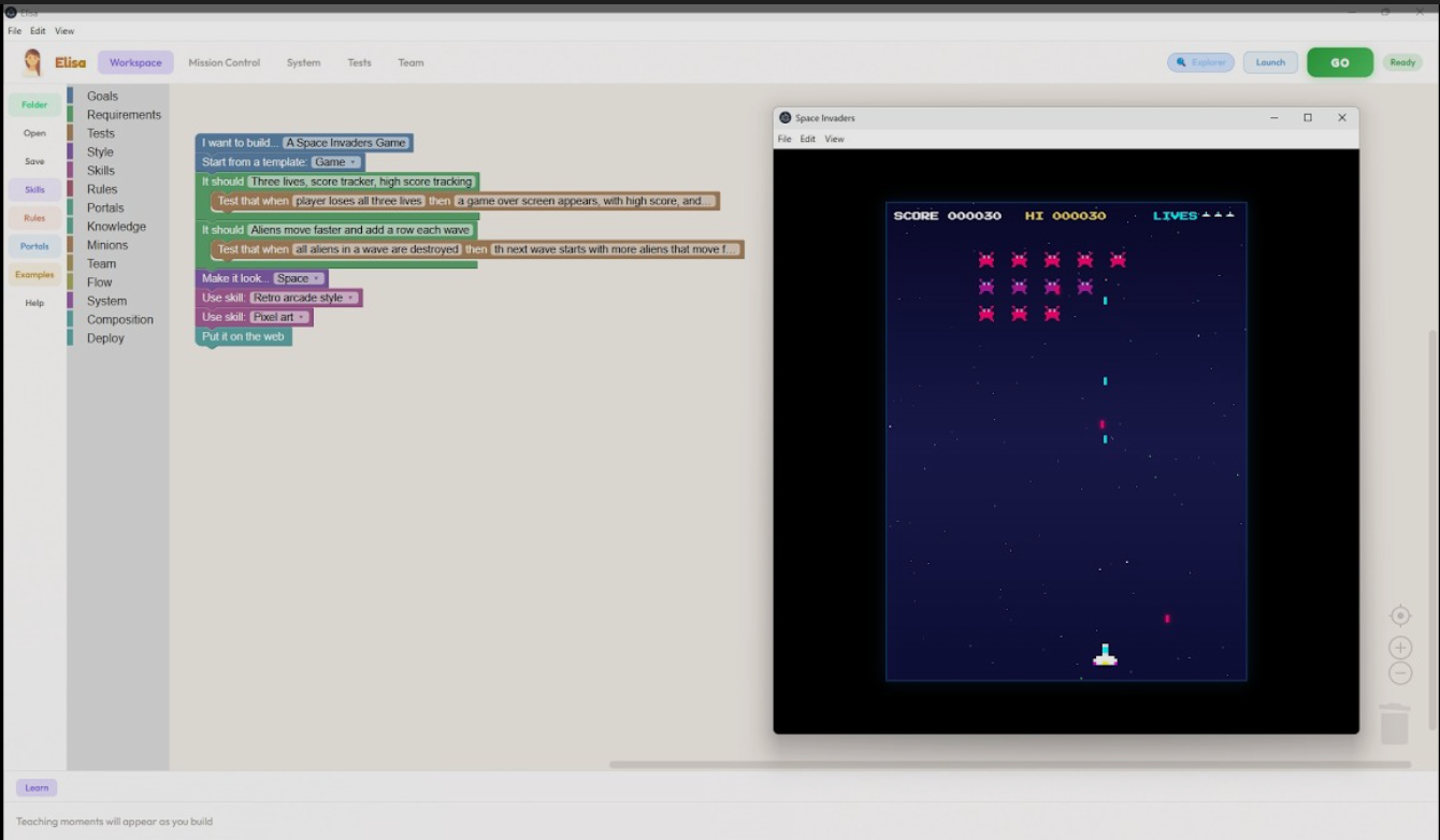 Elisa is a block-based visual integrated development environment (IDE) where users can design software by snapping together primitives (goals, requirements, agents, skills, rules, portals, deployments) while AI writes the real code behind the scenes. Users write a spec in a visual language, a meta-planner decomposes it into a task graph, and agents handle the rest. A built-in teaching engine surfaces age-appropriate explanations of the programming concepts being used, turning every build into a lesson. Jon’s daughter used it to flash code onto a microcontroller for her project without writing a single line of code.