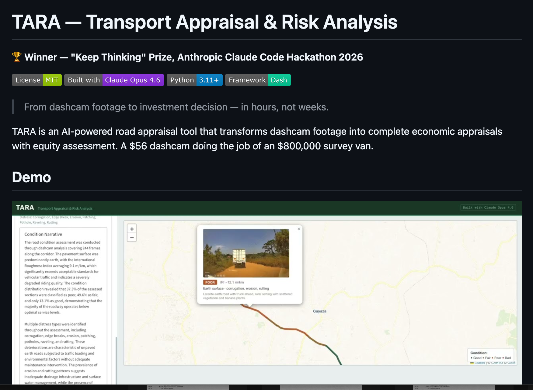 TARA turns dashcam road footage into a complete investment appraisal. The tool uses Opus 4.6's vision capabilities to analyze every frame and identify surface conditions, distress patterns, and roadside activity including pedestrians, cyclists, and market stalls. The system segments the road into condition sections, auto-populates intervention costs, and generates a full economic appraisal including NPV, cash flow projections, and sensitivity analysis. It also produces an equity score, assessing who actually benefits from the investment, factoring in nearby facilities and areas of high concern identified during the drive.