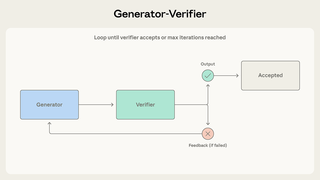 Consider a support system that generates email responses to customer tickets. The generator produces an initial response using product documentation and ticket context. The verifier checks accuracy against the knowledge base, evaluates tone against brand guidelines, and confirms the response addresses each issue raised. Failed checks return to the generator with feedback that names the exact problem, such as a feature misattributed to the wrong pricing tier or a ticket issue left unanswered.