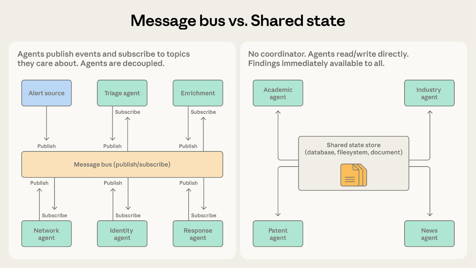 If agents in a message bus system are publishing events to share findings rather than trigger actions, shared state is a better fit.