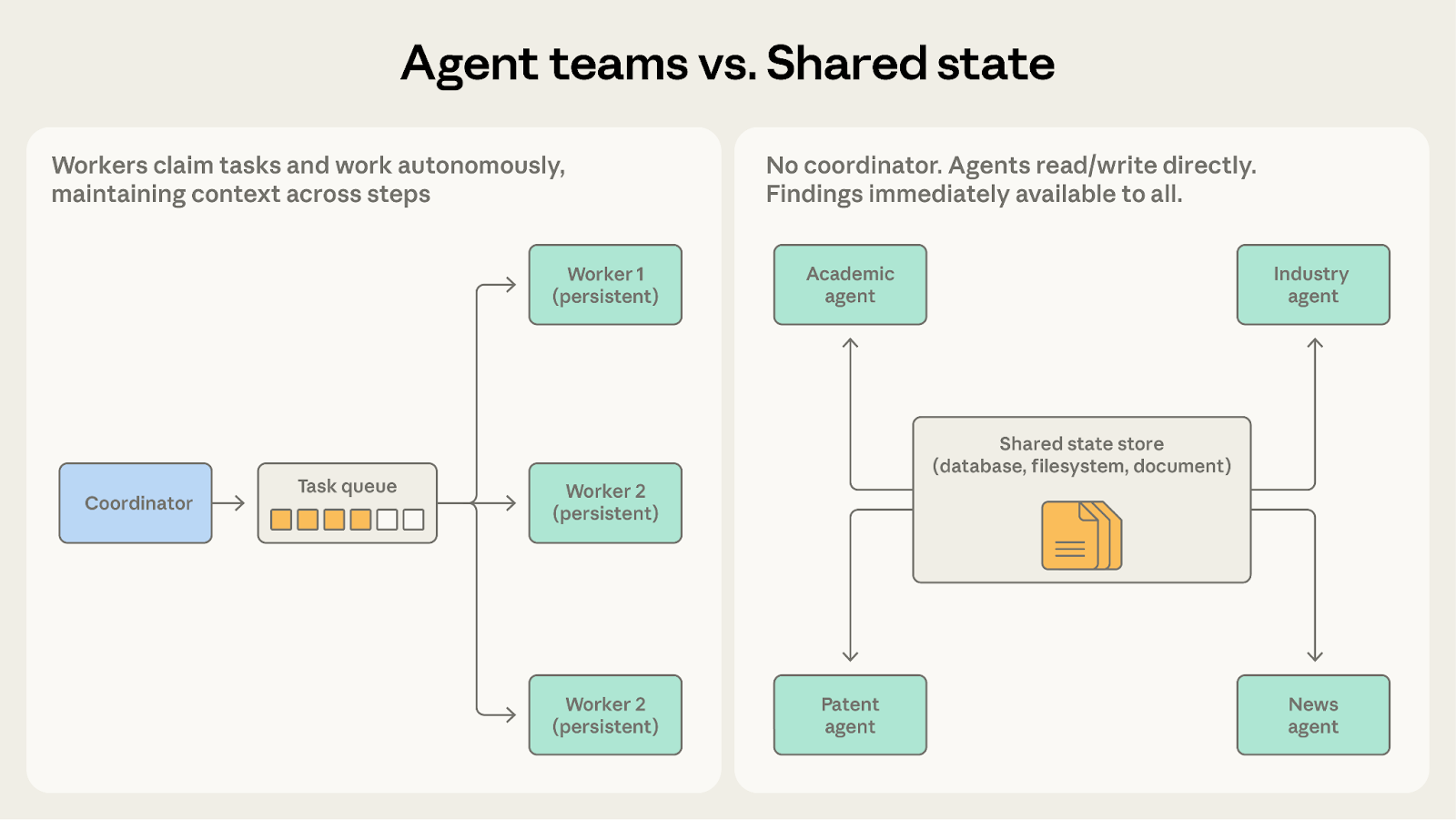 With shared state, findings go directly into the store. The industry agent can see the academic agent's discoveries immediately, without waiting for a coordinator to route the information. Agents build on each other’s work, and the shared store becomes an evolving knowledge base.