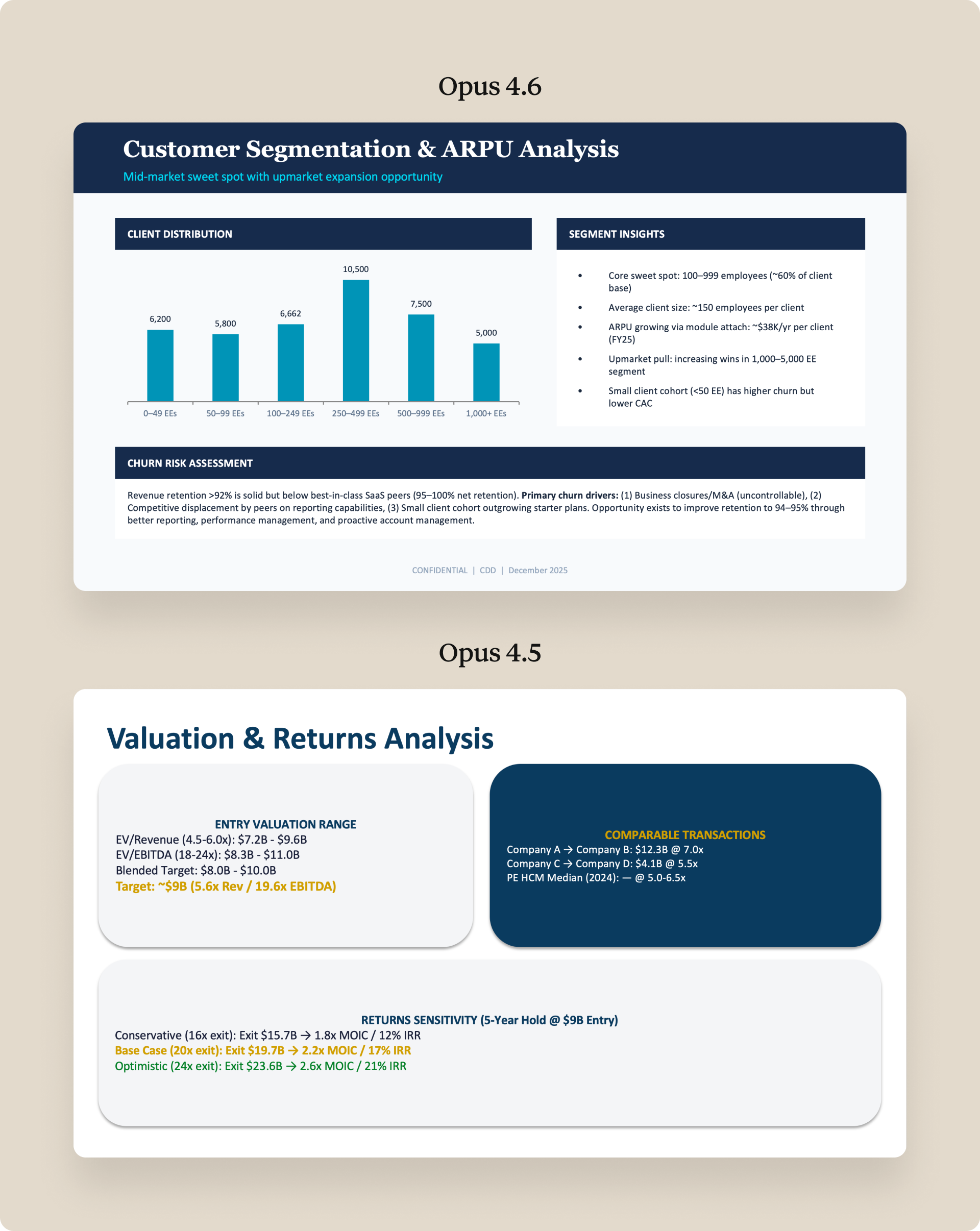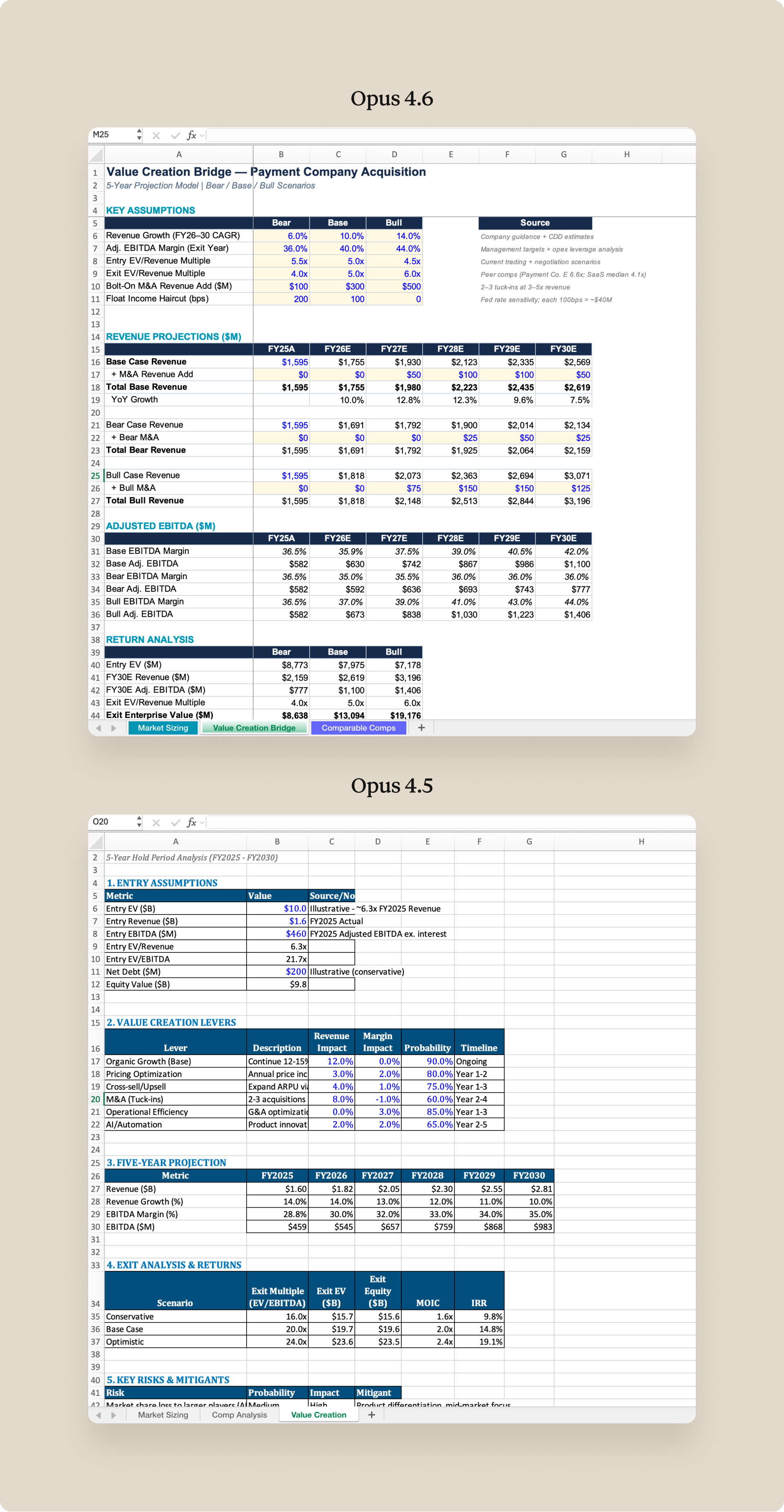 On creation, we use GDPval-AA to measure Claude’s performance on complex knowledge work, in addition to our Real-World Finance evaluation. With Claude Opus 4.6, structured outputs like spreadsheets and presentations come out right more often on the first pass. The side-by-side outputs below show how output quality has improved from Claude Opus 4.5 to Opus 4.6. These are examples of Claude’s first-pass performance on a commercial due diligence task (evaluating a potential acquisition)—the kind of work that would typically take a senior analyst two to three weeks to complete.