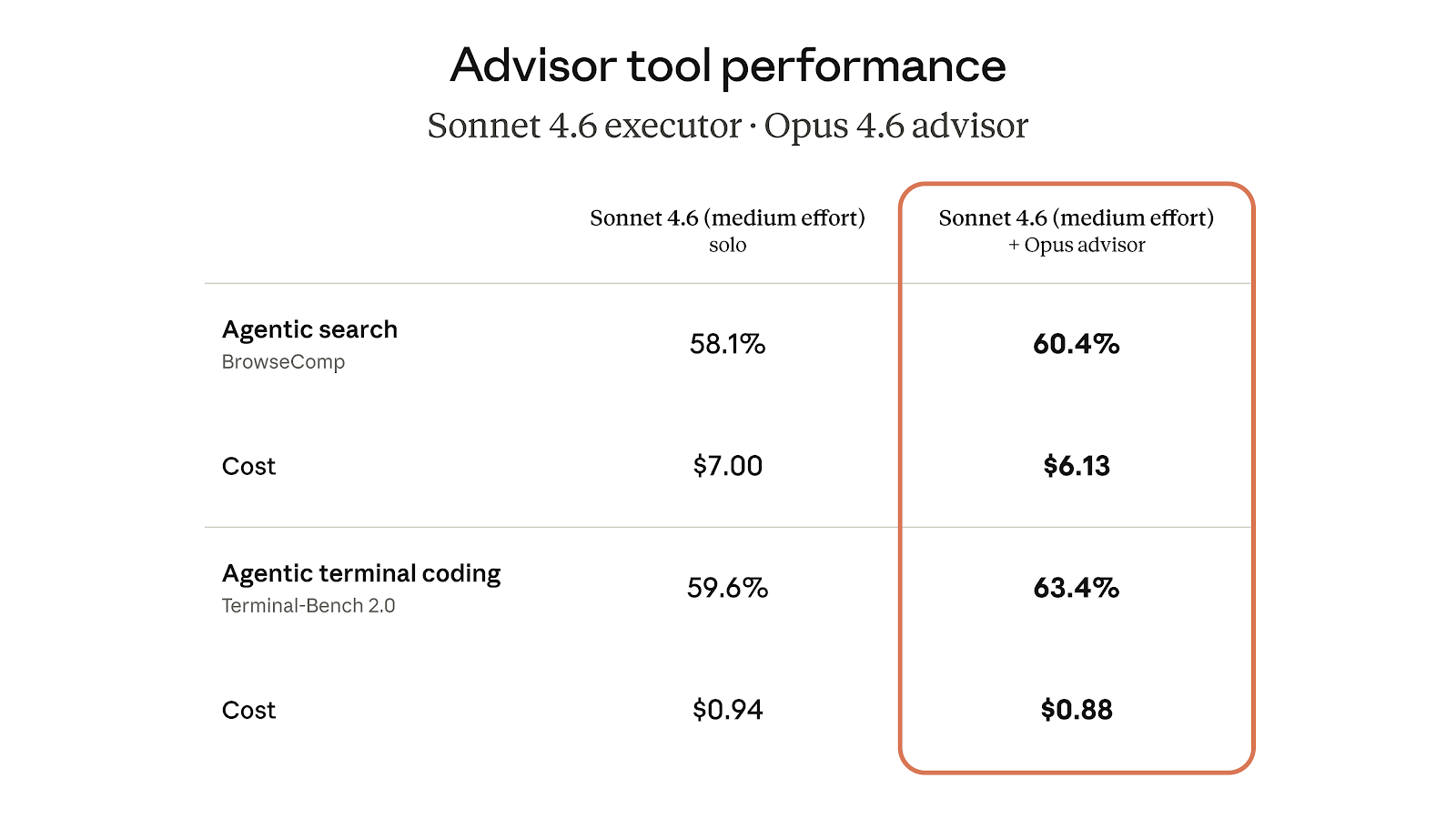 In our evaluations, Sonnet with an Opus advisor improved scores across BrowseComp2 and Terminal-Bench 2.03 benchmarks while costing less per task than Sonnet alone.