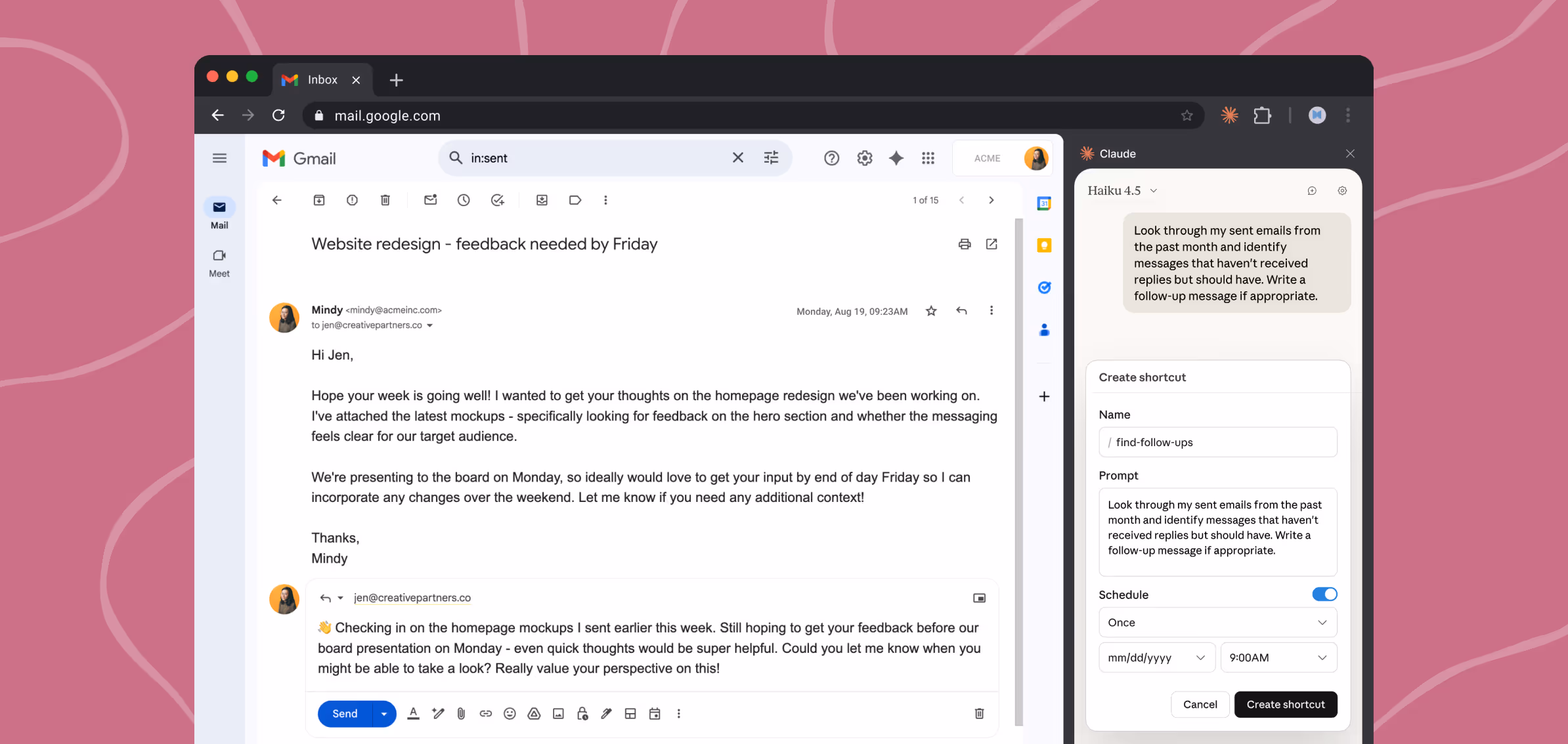 Bring Claude into your workflow to make apps work better, without leaving the browser.