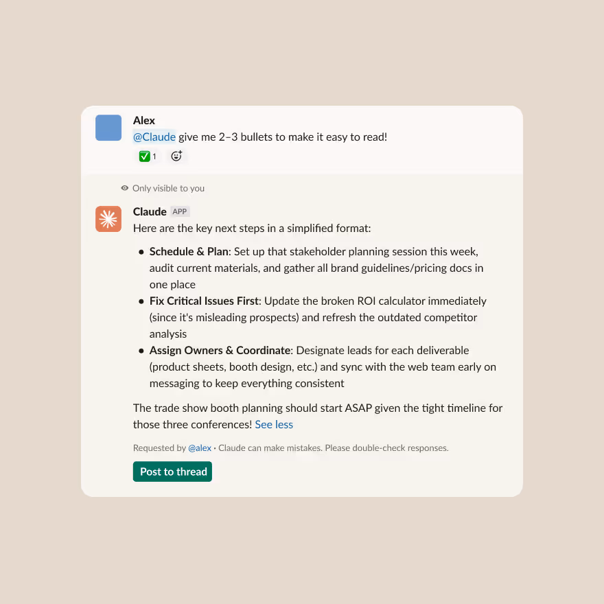Draft emails, documentation, and proposals in your Claude DM, then share directly in relevant channels.