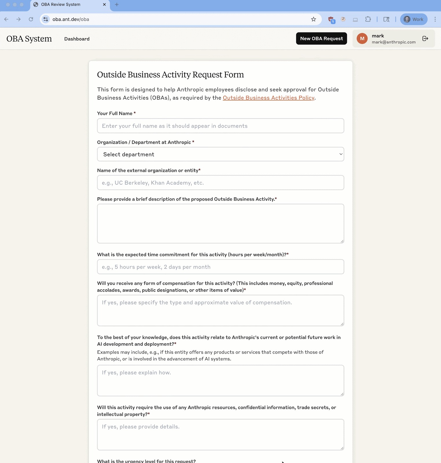 The Legal Team's Outside Business Activity Request Form expedite the process of assessing conflict-of-interest reviews for Anthropic employees.