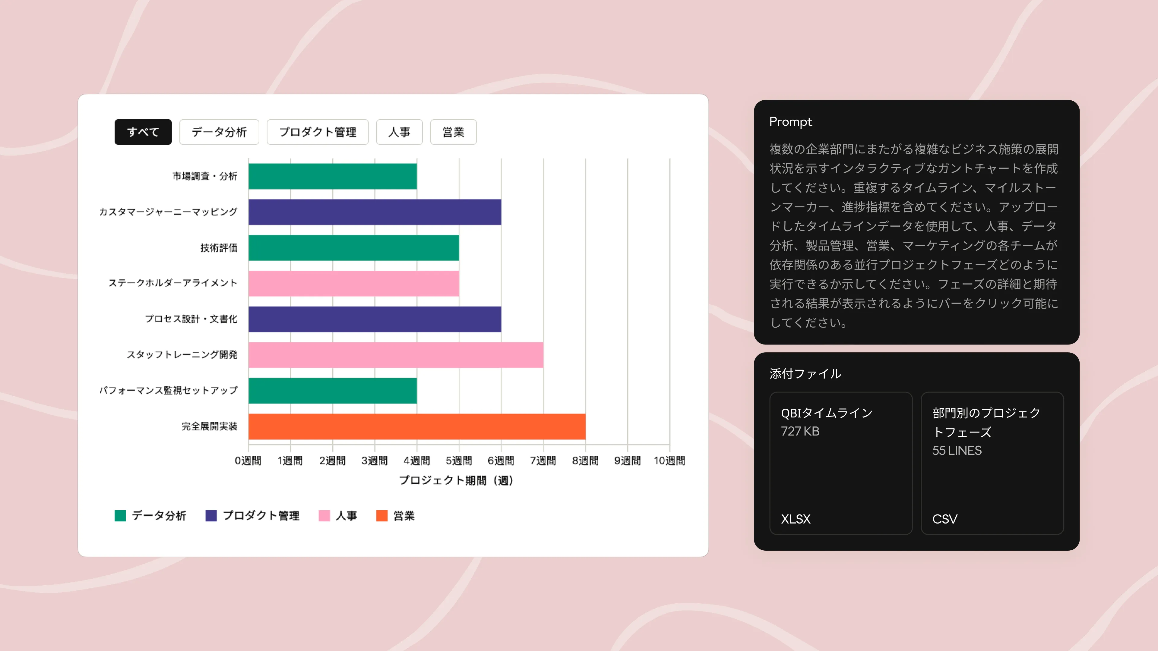 どんなに複雑な事柄でも、分かりやすく整理します。[[データの分析|データ分析|ファイルをアップロードしてパターンを特定し、統計を計算し、業務上または個人的な意思決定に役立つ実用的な洞察を得ることができます。]]、[[可視化|データの可視化|チャートやダイアグラムを作成してデータを明確にします。重要なパターンを強調する視覚資料を用いて洞察を共有します。]]の作成、文書のレビュー、意思決定の評価、重要な選択肢の細分化を行います。