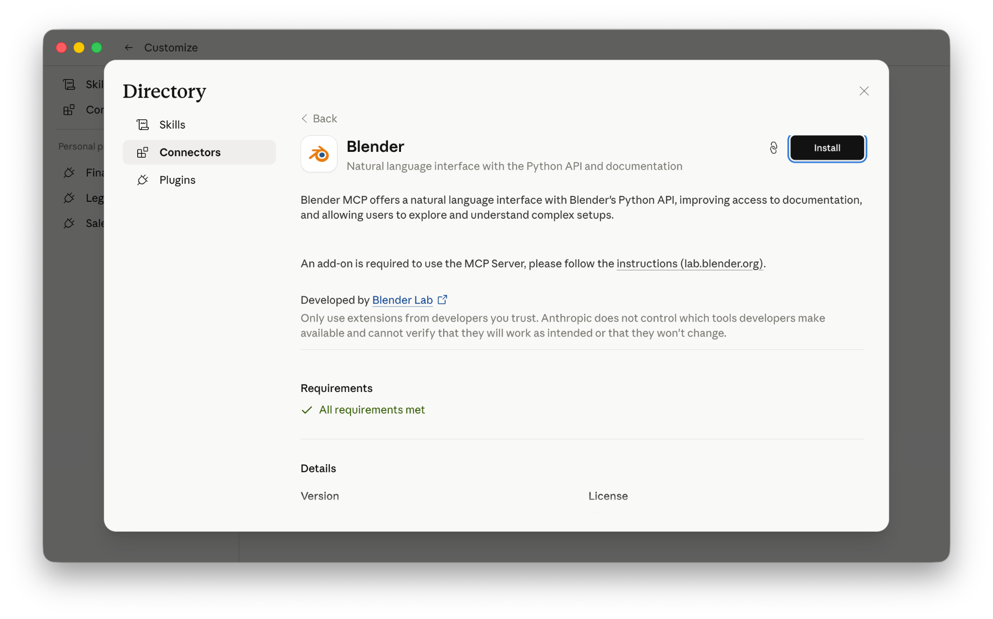 In Claude Desktop, go to Customize > Connectors, search for Blender, and select Add.
