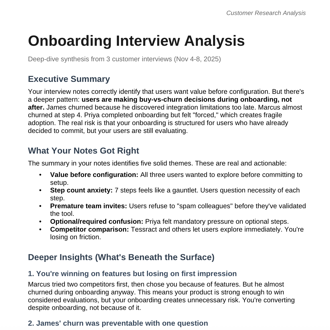 You have interview notes from Marcus, and likely others. Paste a batch of interview notes and ask: "What are the top 3 friction points across these interviews? Include direct quotes as evidence." I'll find patterns you might miss when reading them one by one.
