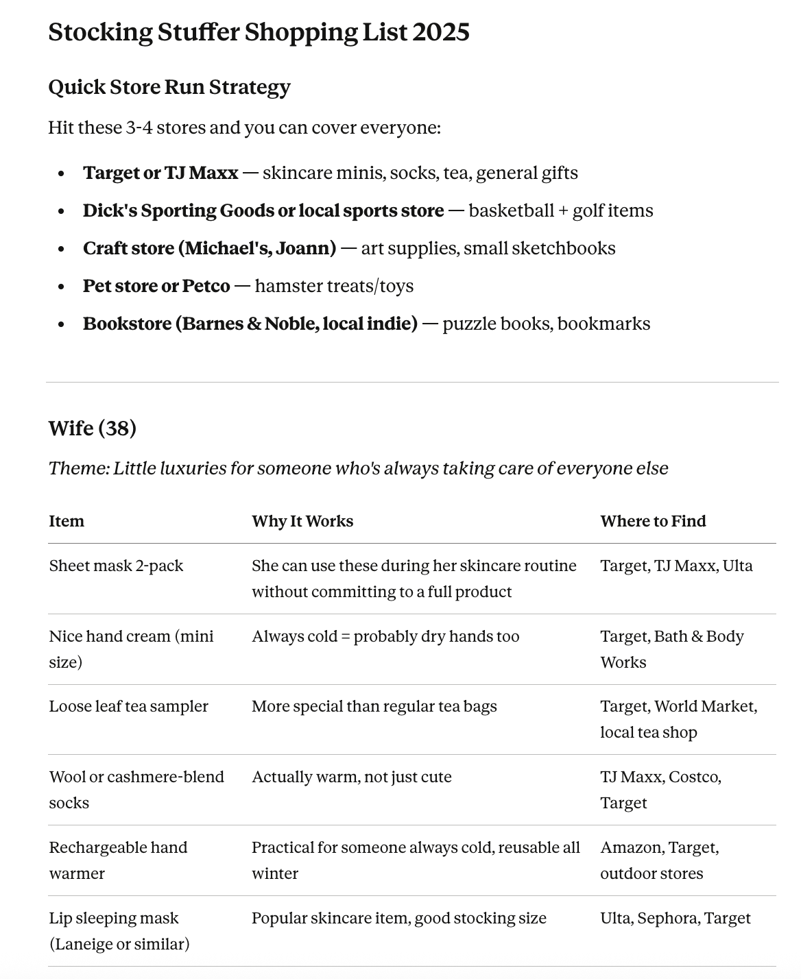 Once Claude generates ideas, ask it to reorganize the list by store type rather than by person. This makes it easier to see everything you need from Target in one place versus bouncing between sections of the list.