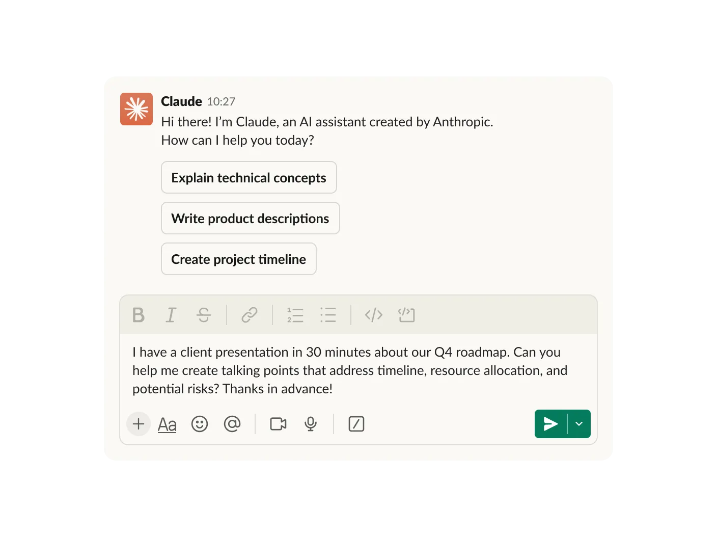 Claude in Slackでは、研究、ファイルの作成と編集、拡張思考を開始することはできません。Claudeが誤った情報を生成する場合もあるため、必ず回答を再確認してください。