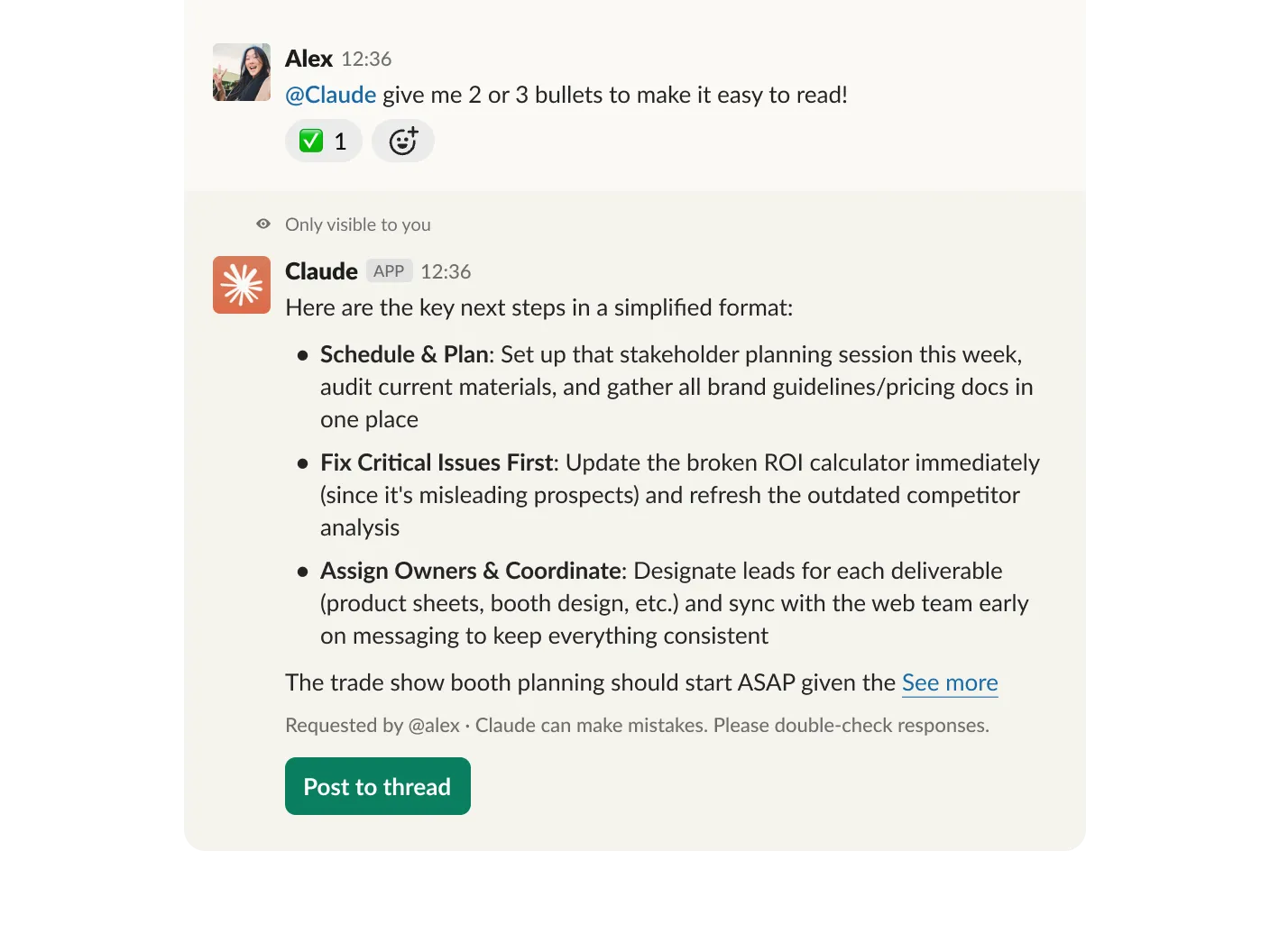Claude will draft a response based on the conversation, which you can review and approve before sharing with the group.